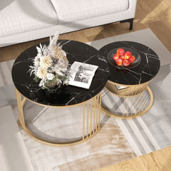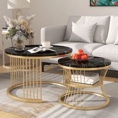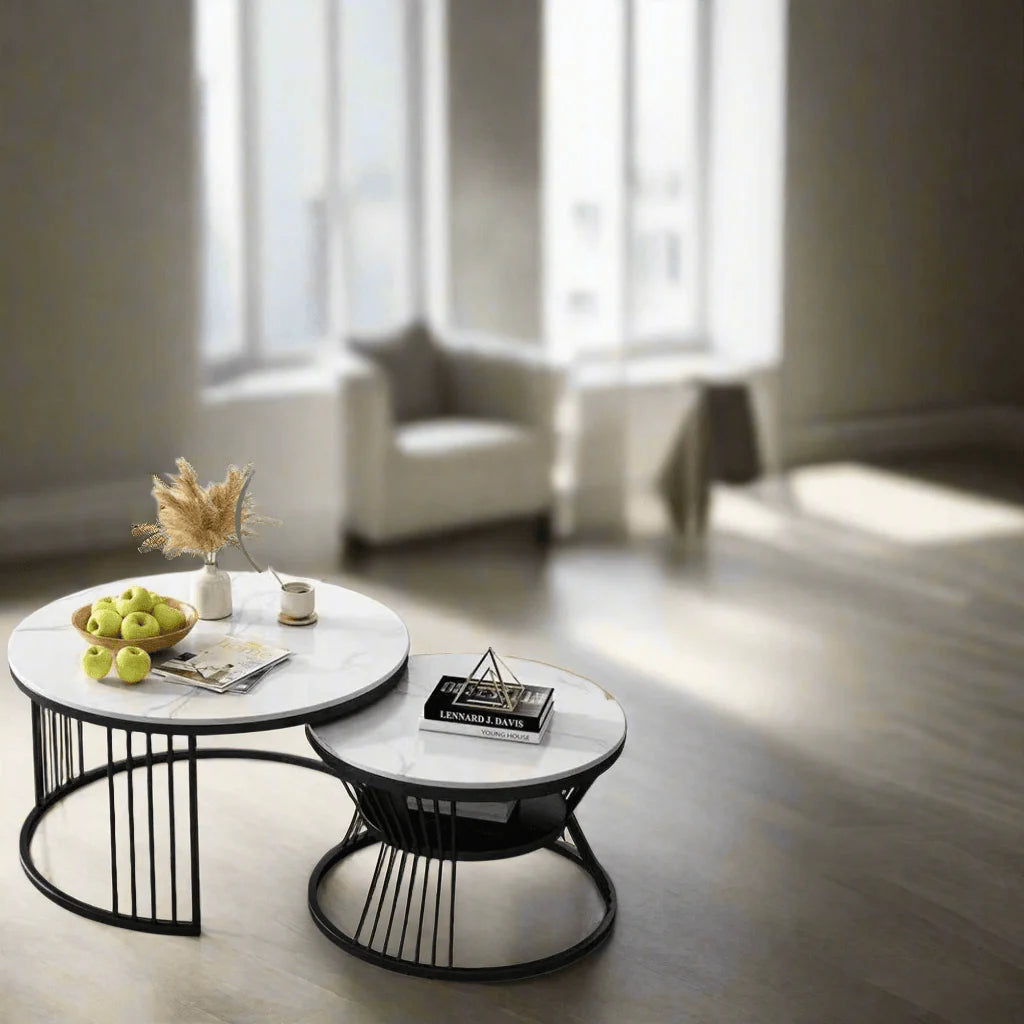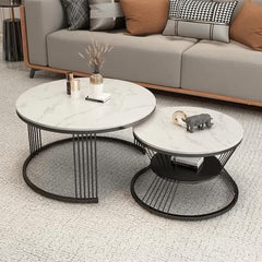 Set of 2 Round Coffee Tables - Get the perfect modern and Modern addition to your living space with this set of two round coffee tables. With a sturdy wrought iron frame, these tables feature a unique wooden twist that makes them both stylish and practical.
