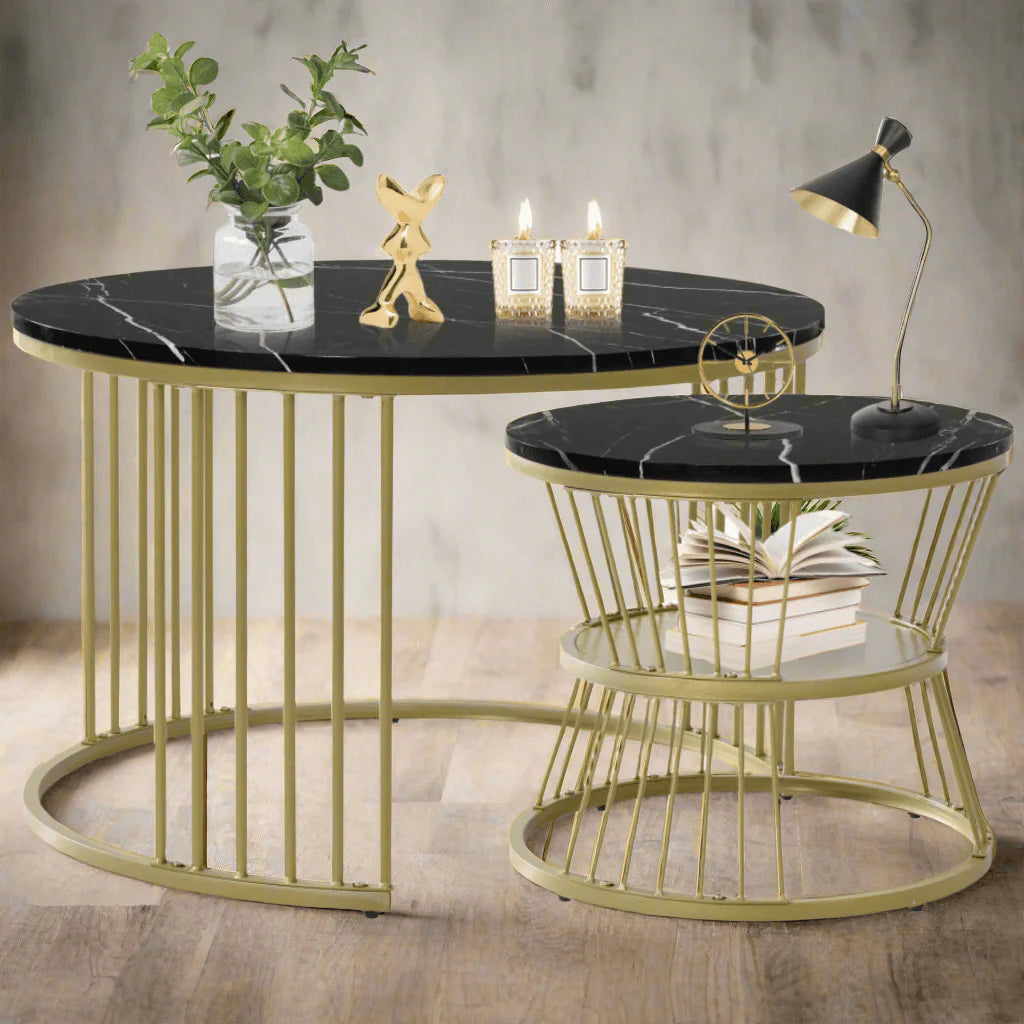 Wrought Iron & Laminate - This set of 2 comes with sturdy metal frames that have Modern designs and are coated in a glossy golden finish. The table top is laminated, ensuring lasting use without any wear or tear.
